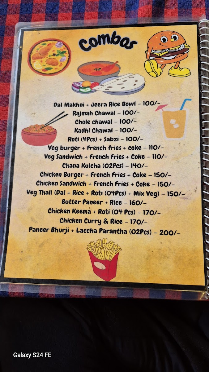 Additional menu categories cover soups, including tomato, hot & sour, and lemon coriander varieties, as well as shakes in multiple flavors. There are also Indian main course options such as dal makhni with jeera rice, rajmah chawal, chole chawal, and kadhi chawal. Alongside these, the menu includes combination plates like roti with sabzi and various burger and sandwich combos paired with French fries and soft drinks, catering to quick meals or casual dining experiences.